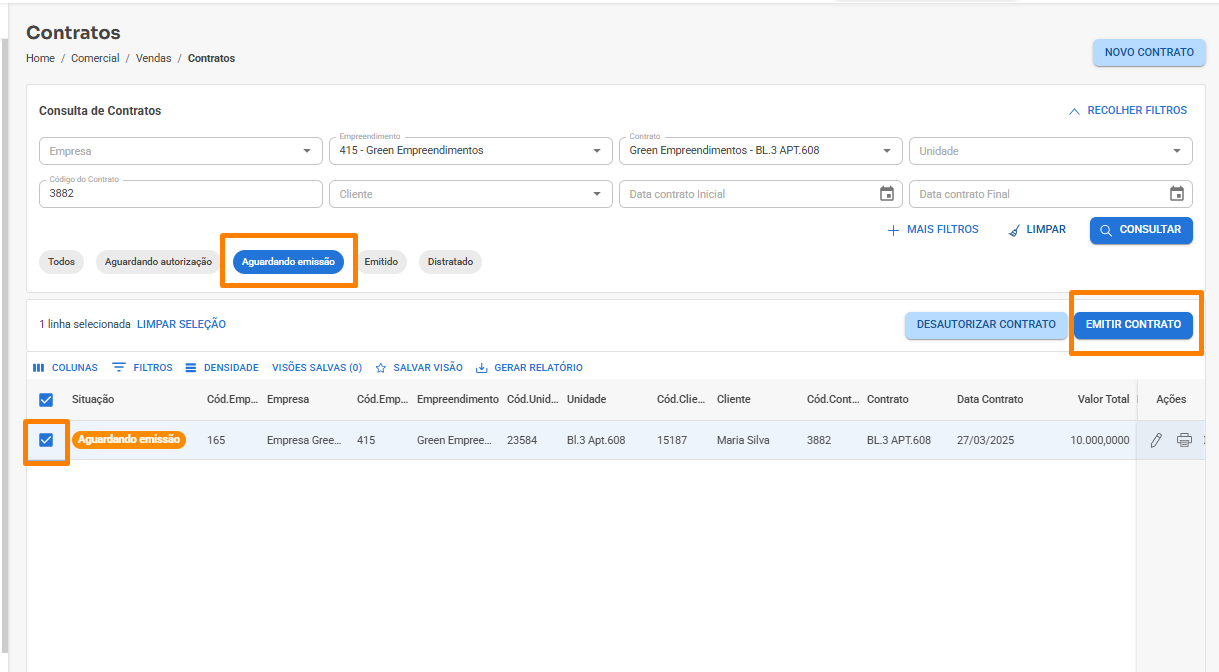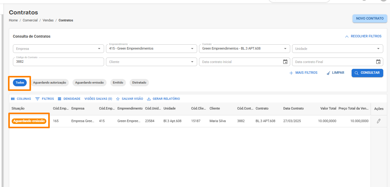 - Após ter cadastrado e autorizado o contrato de venda em Comercial/Vendas/Contratos, para realizar a emissão deverá primeiramente consultar o contrato, ele irá aparecer na aba "Todos" como Aguardando emissão: