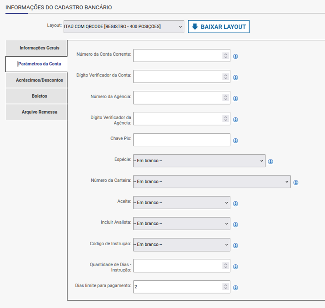 Menu: Apoio > Contas Correntes > Aba “Cobrança escritural” > Parâmetros da conta, conforme imagem abaixo:
