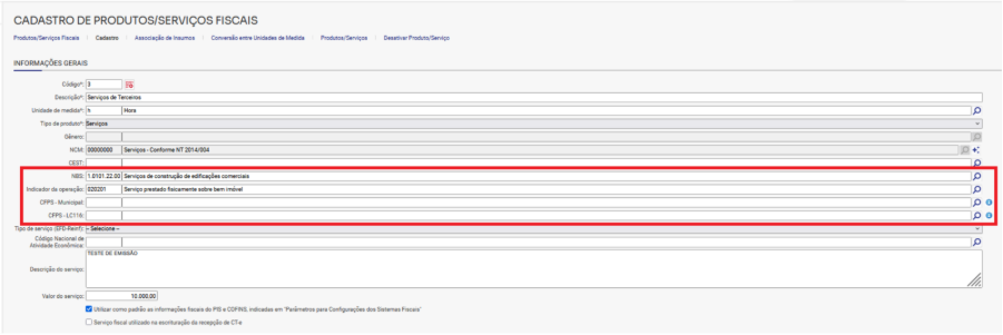 Apoio > Produto/Serviços > Produto/Serviços FiscaisLocalize o serviço e preencha os campos abaixo.