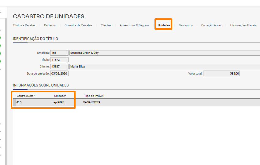 2. Neste caso acesse Financeiro/Contas a receber/Títulos, na aba Unidades verifique qual é a unidade e centro de custo:
