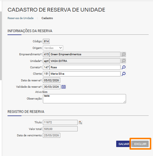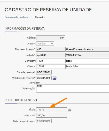 3. Depois acesse Comercial/Gestão de unidades/Reserva de Unidades, consulte pela unidade e abra a edição, neste local terá o cadastro da reserva e poderá confirmar o número do título na parte de Registro de Reserva: