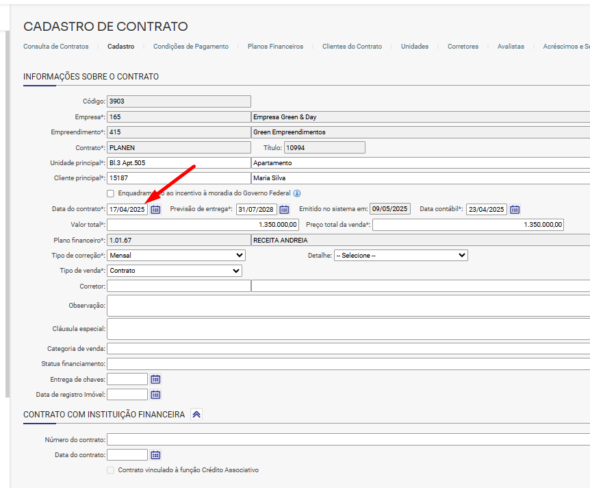 1.1 Observe que a data de emissão da previsão ficou igual a data do contrato:
