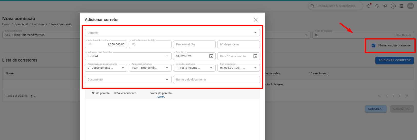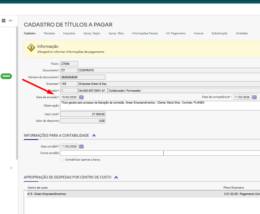 1. 2 Quando liberamos essa previsão, vamos supor que seja em 2026 quando recebe a nota do corretor, ao colocar as informações do título de liberação é possível digitar a data de emissão desejada, por exemplo em 2026, período contábil que não está bloqueado:
