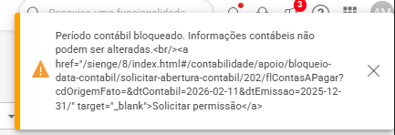 Nesta situação o usuário poderá pedir a abertura do período contábil em: Contabilidade/ Fiscal > Apoio > Integração Contábil > Solicitação de Abertura de Bloqueio Contábil .