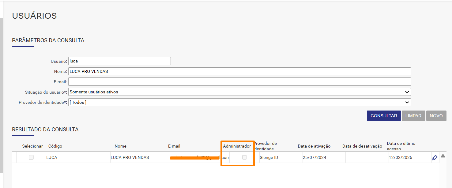 Para verificar se o usuário é administrador do sistema, acesse Segurança/Usuários/Cadastros, consultar o usuário e verificar se ele é administrador, caso não, ele terá que ter algumas permissões:
