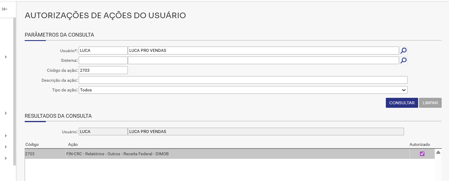 - Em Segurança/Autorizações/Usuários/Ações do usuário, será preciso que tenha permissão a ação de código 2703: