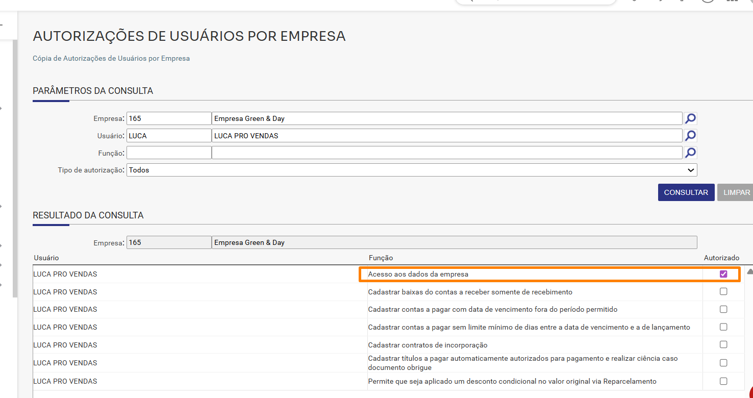 - Em Segurança/Autorizações/Usuários/Empresas, será preciso que tenha permissão a empresa que irá gerar os dados da DIMOB, função: "Acesso aos dados da empresa":