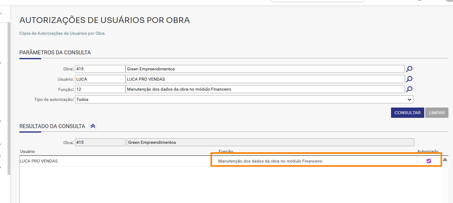 - Em Segurança/Autorizações/Usuários/Obras, será preciso que tenha permissão a obra que irá gerar os dados da DIMOB, função 12: " Manutenção dos dados da obra no módulo Financeiro: