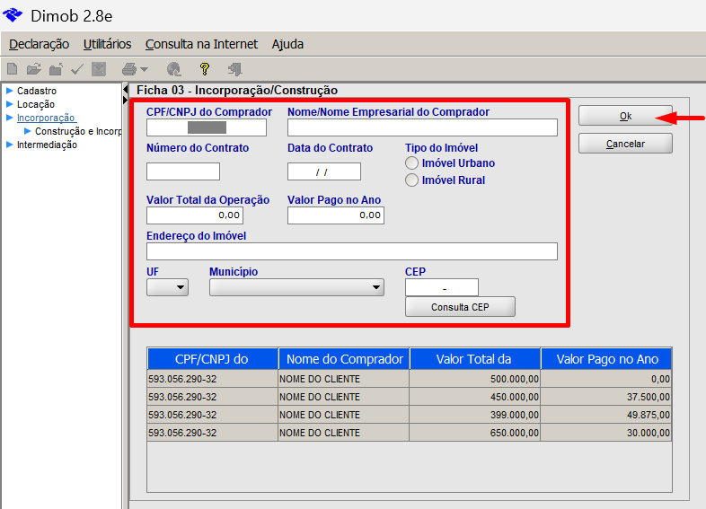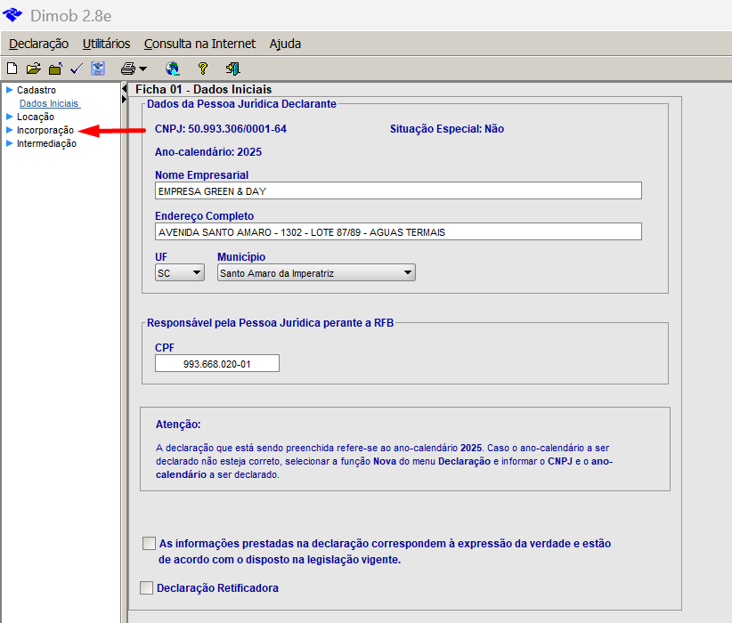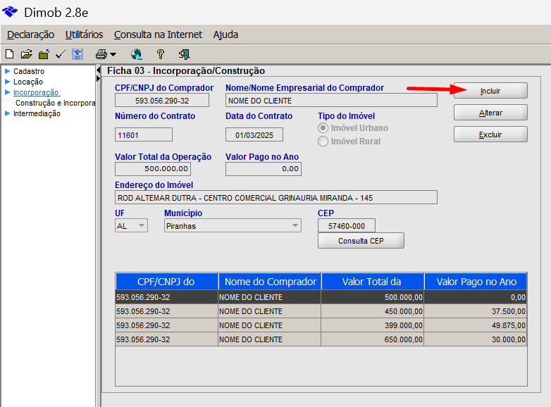 1. Após importar o arquivo no aplicativo da Dimob, clique na ficha que precisa fazer alteração, neste exemplo será o valor pago de um contrato de venda, então será preciso clicar em "Incorporação":