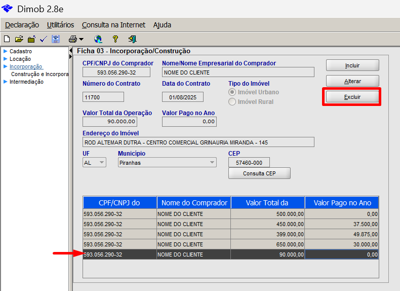 2. Poderá também excluir algum registro, basta clicar na linha referente ao contrato e depois clicar em "Excluir", exemplo:
