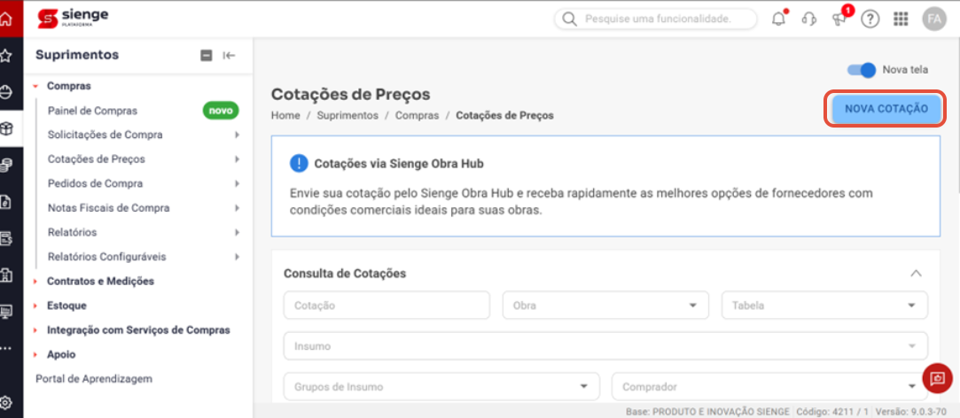Clique em Nova Cotação.