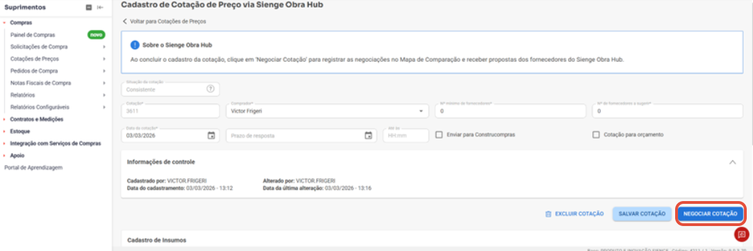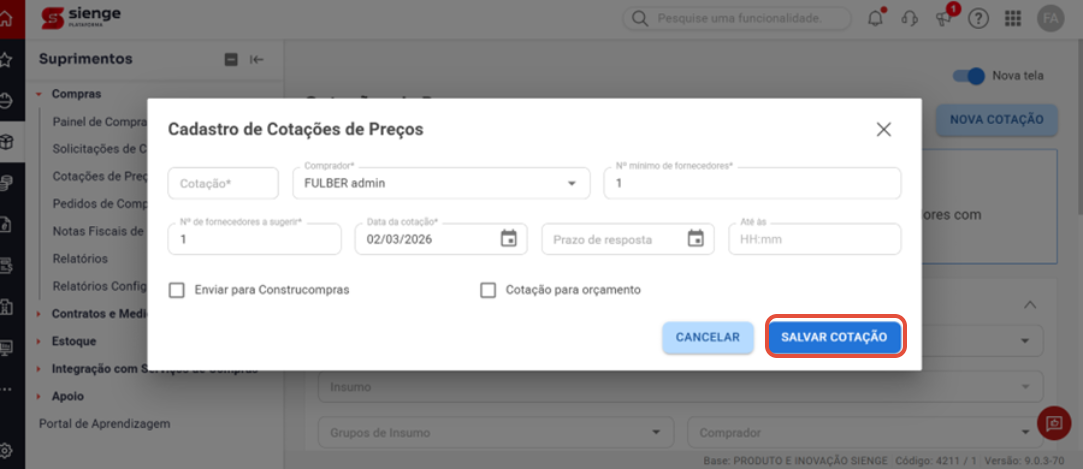 Suprimentos > Compras > Cotações de Preços