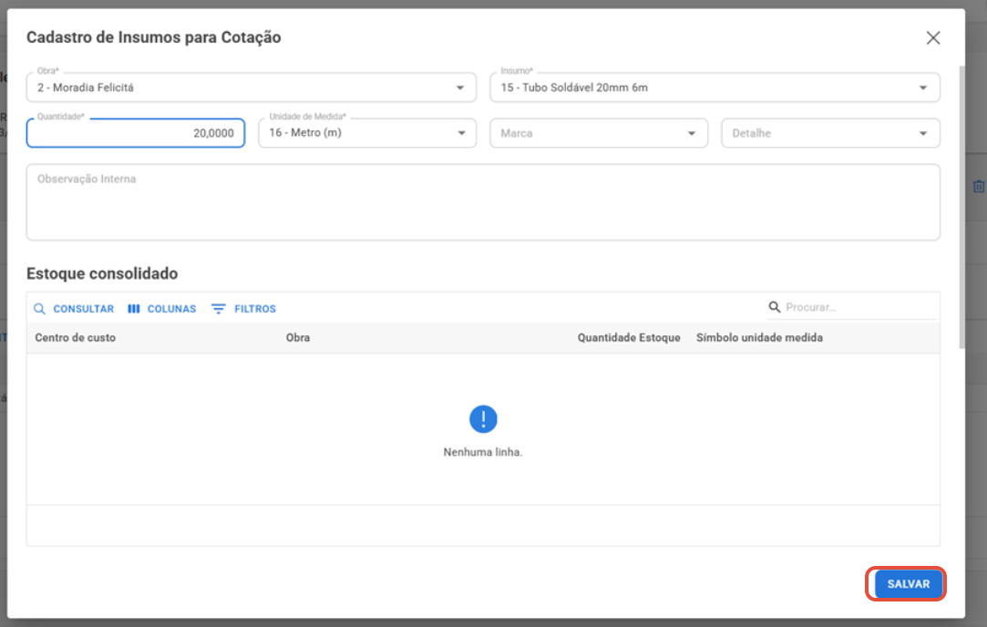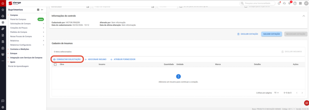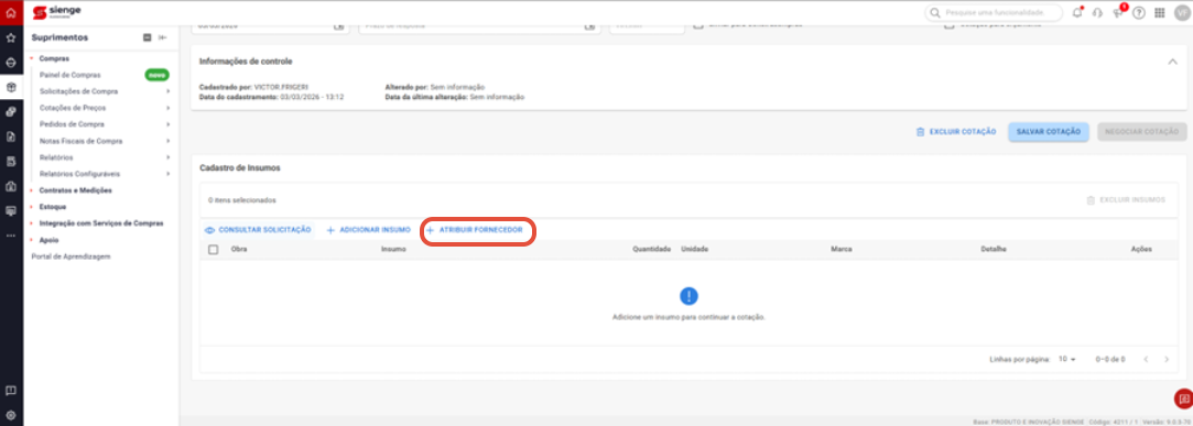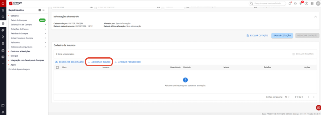 2. Adicionar insumos à cotação