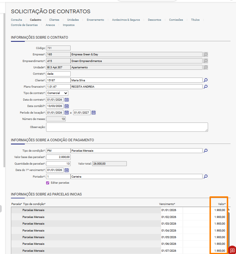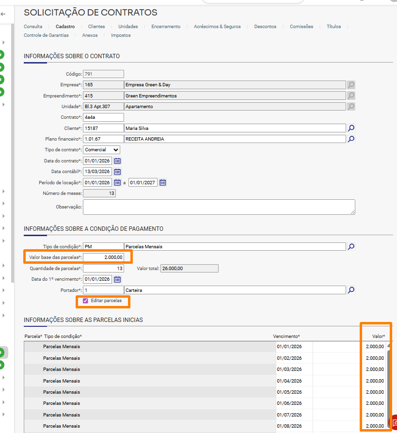 Em Comercial/Locação de imóveis/Contratos, ao cadastrar um novo contrato de locação ou editar um contrato que esteja aguardando emissão, foi definido o valor de R$ 2.000,00 para cada parcela.