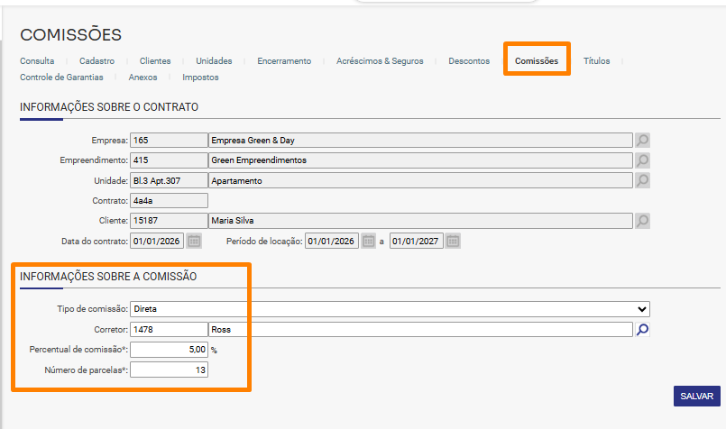 2. Na aba “Comissões”, é possível definir que a comissão será do tipo Direta e informar os demais dados necessários, como o Corretor, o Percentual de Comissão e o Número de Parcelas: