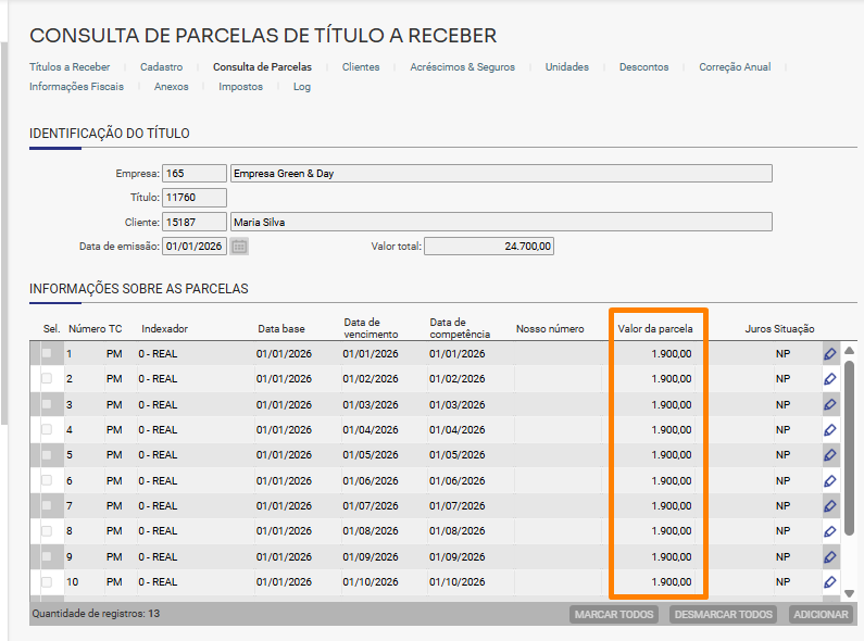 Ao clicar na opção “Editar parcelas”, é possível visualizar detalhadamente o valor de cada uma delas: