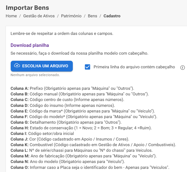 A planilha deve conter os dados dos bens que serão cadastrados.