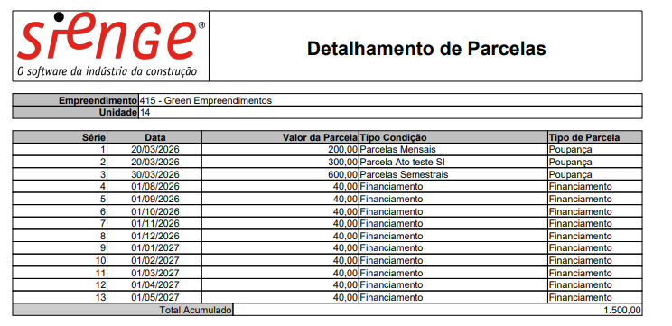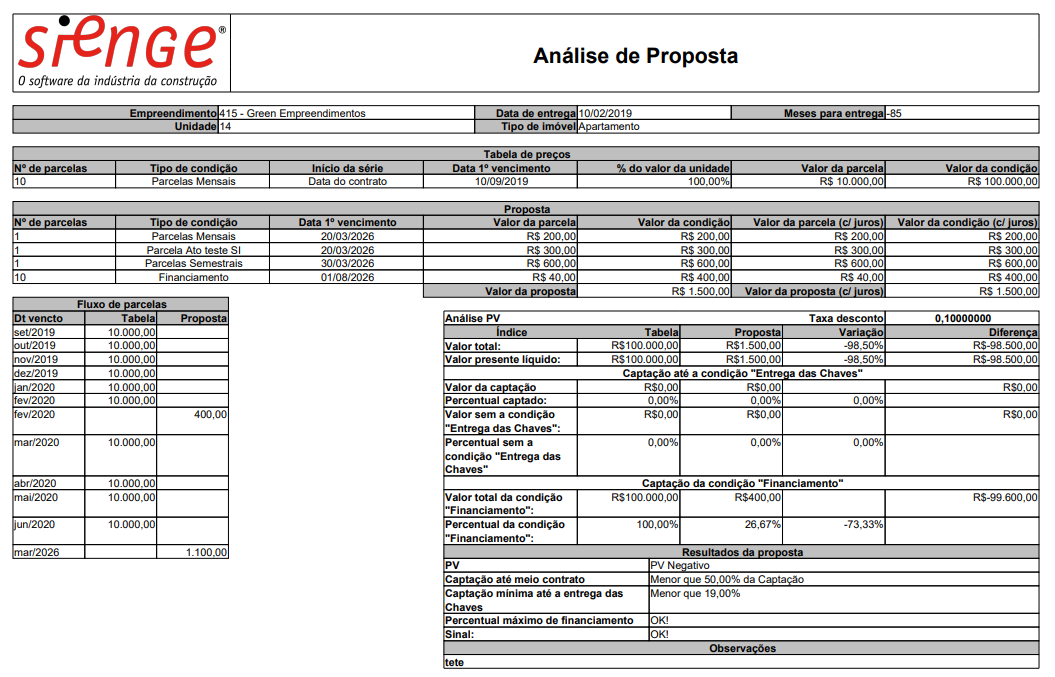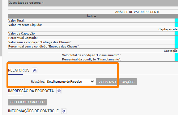 Será apresentada de forma detalhada as informações da proposta, Tabela de preços, condições de pagamento, fluxo de parcelas entre outros: