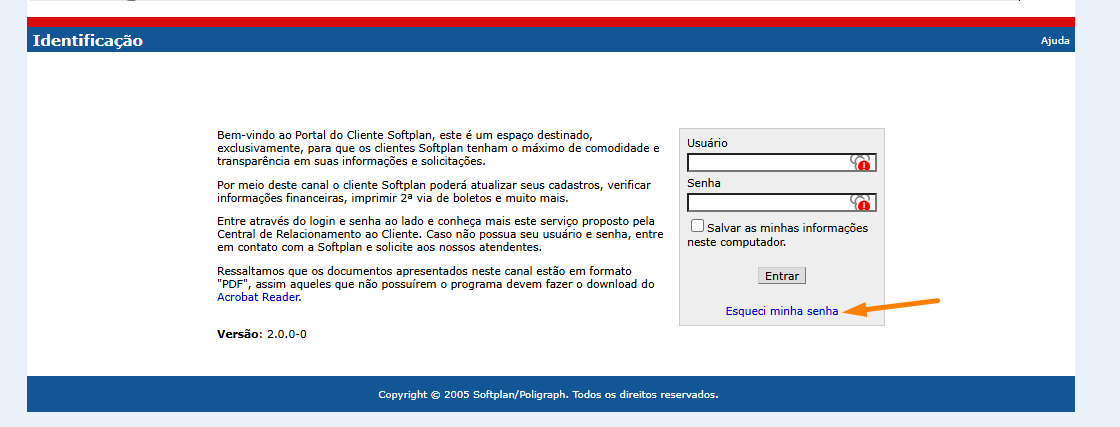 1. Caso o cliente não se recorde dos seus dados de acesso: usuário e senha, deverá clicar em "Esqueci minha senha":