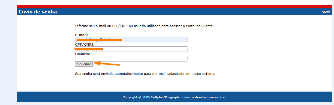 1.1 Informar o e-mail que está em seu cadastro do Sienge em Apoio/Pessoas/Clientes e o CPF/CNPJ, em seguida clicar em "Solicitar", exemplo: