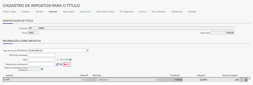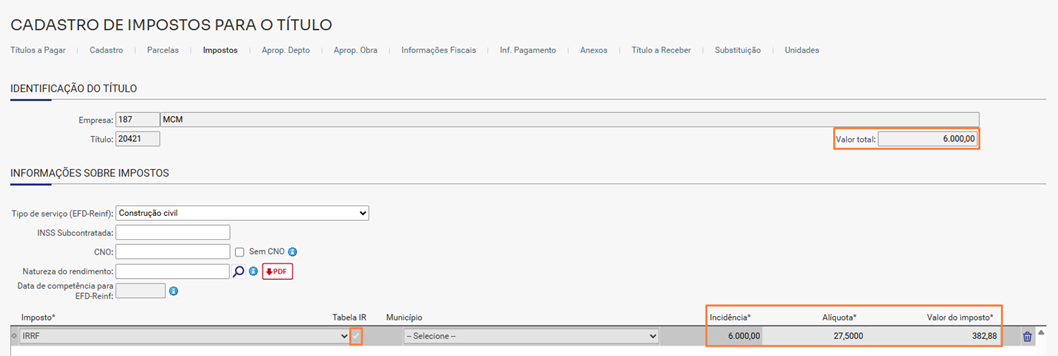 2. Cadastrar o título com cálculo de IR