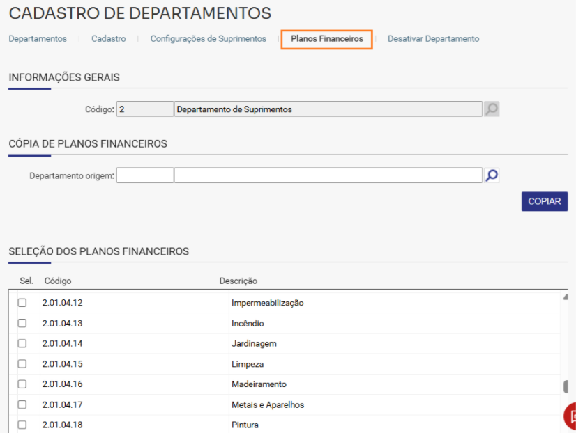 - 1293 - Controlar uso de contas do plano financeiro por departamento
