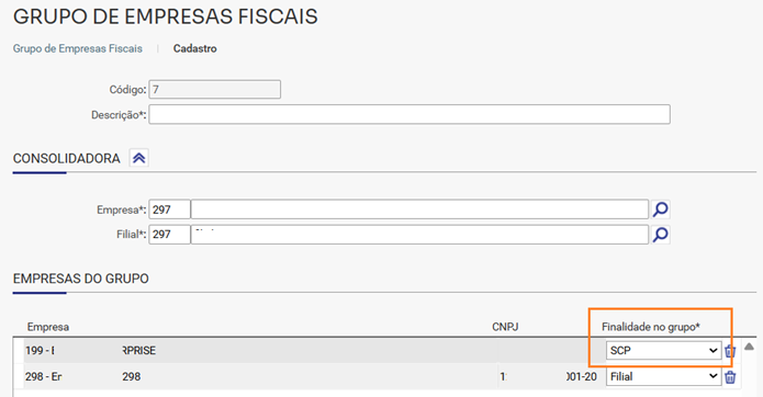 - Confirme se a empresa do grupo está definida com a finalidade SCP.